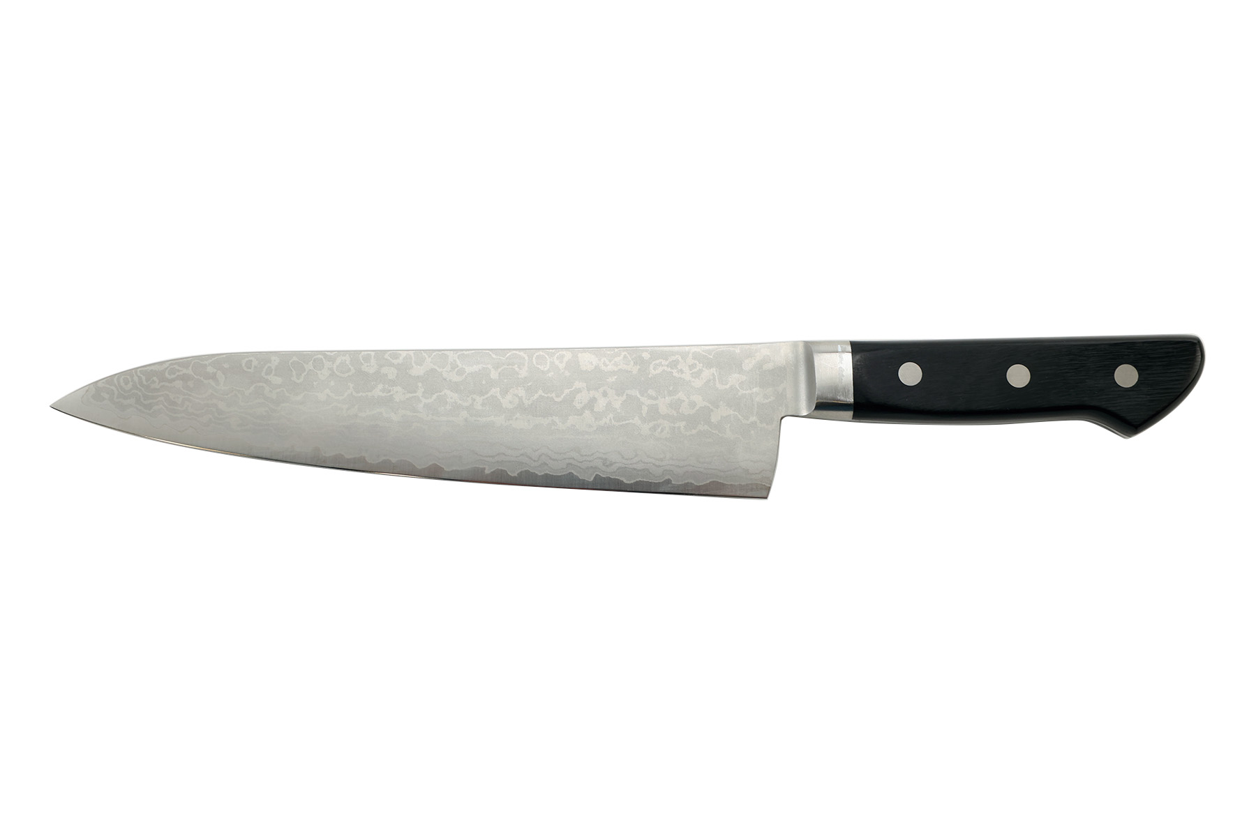 Lame de 21 cm en acier VG10 au centre et damas 33 couches sur les flancs.